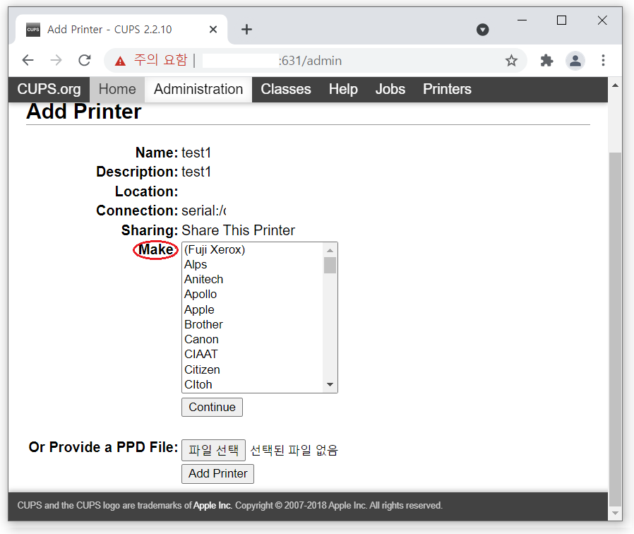 You must access this page using the URL https://내부 ip주소:631/admin/.위와 같은 메세지가 뜬 뒤 아래의 페이지로 전환이 된다.