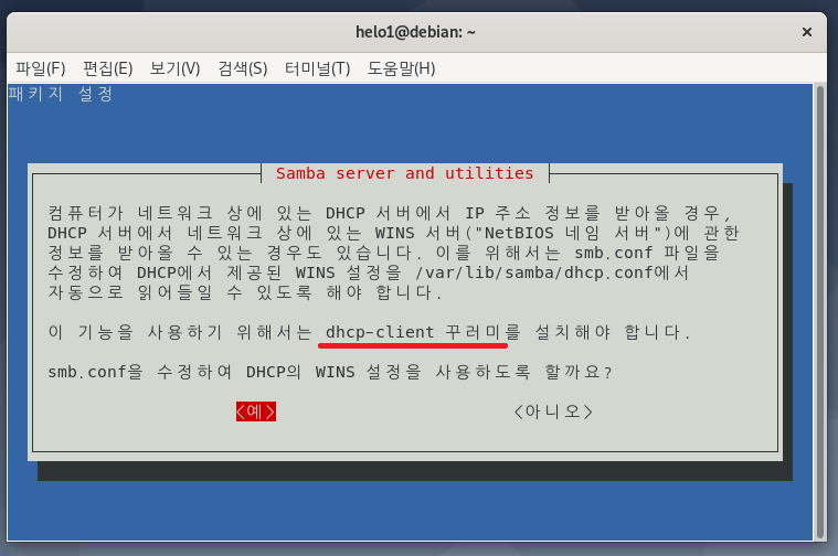 설치를 계속 하면 위와 같은 dhcp-client를 설치 하냐고 묻는 창이 나오는데 예라고 누른다.