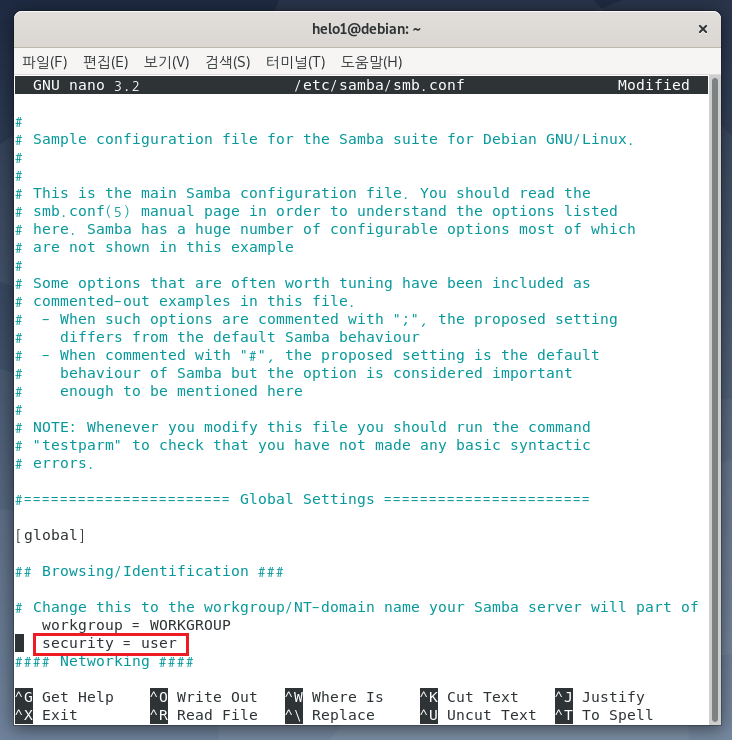 $ sudo nano /etc/samba/smb.conf workgroup = WORKGROUP 란을 찾아 바로밑에 security = user를 적는다.